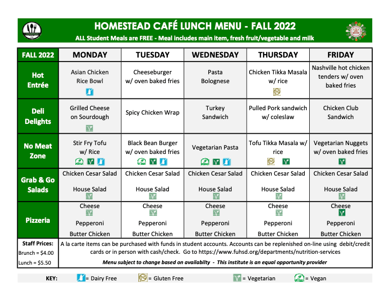 Current fall 2022 menu, with our newly implemented vegan and vegetarian options.
